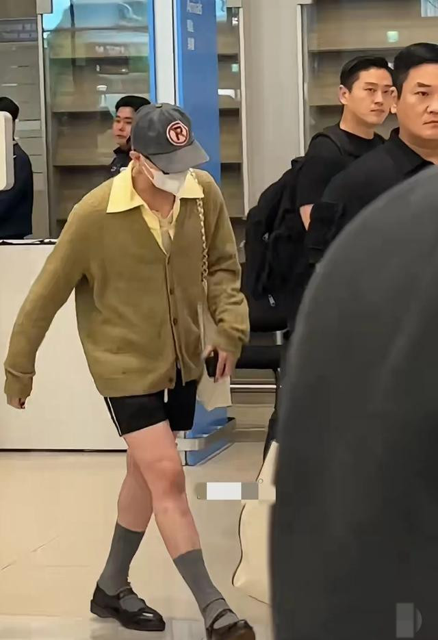 权志龙还穿着在吉隆坡的那套穿搭,绿色的毛衣开衫,搭配黄色衬衫,下半身穿了黑色的短裤,还穿了黑色皮鞋搭配灰色小腿袜。