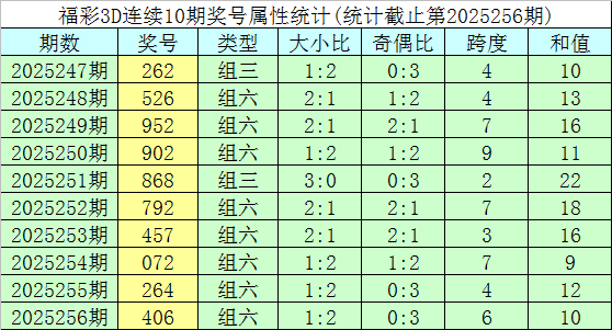 开奖回顾:福彩3D第2025256期奖号为406。奖号形态为组六,大小形态为小小大,奇偶形态为偶偶偶,和值为10,跨度为6。